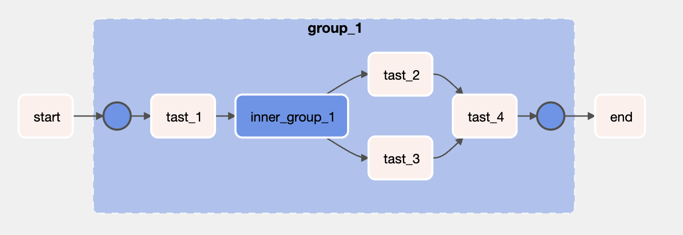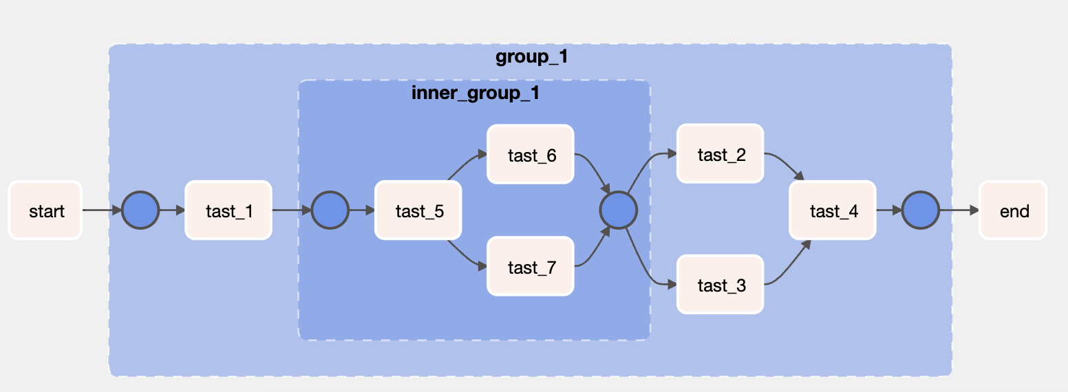 # utills 안에 TaskGroup from airflow.utils.task_group import TaskGroup with DAG (...) as dag: start = ... # group_id가 ui 상에서 보이는 명칭, as 뒤에 명칭이 python script에서 사용하는 명칭 with TaskGroup(group_id='inner_group_1') as innerGroup: task_5 = PythonOperator(task_id='tast_5', python_callable=dump) task_6 = PythonOperator(task_id='tast_6', python_callable=dump) task_7 = PythonOperator(task_id='tast_7', python_callable=dump) task_5 >> task_7 task_5 >> task_6 end = ... # as 뒤에 있는 명칭으로 의존성 연결 start >> innerGroup >> end완성 소스
